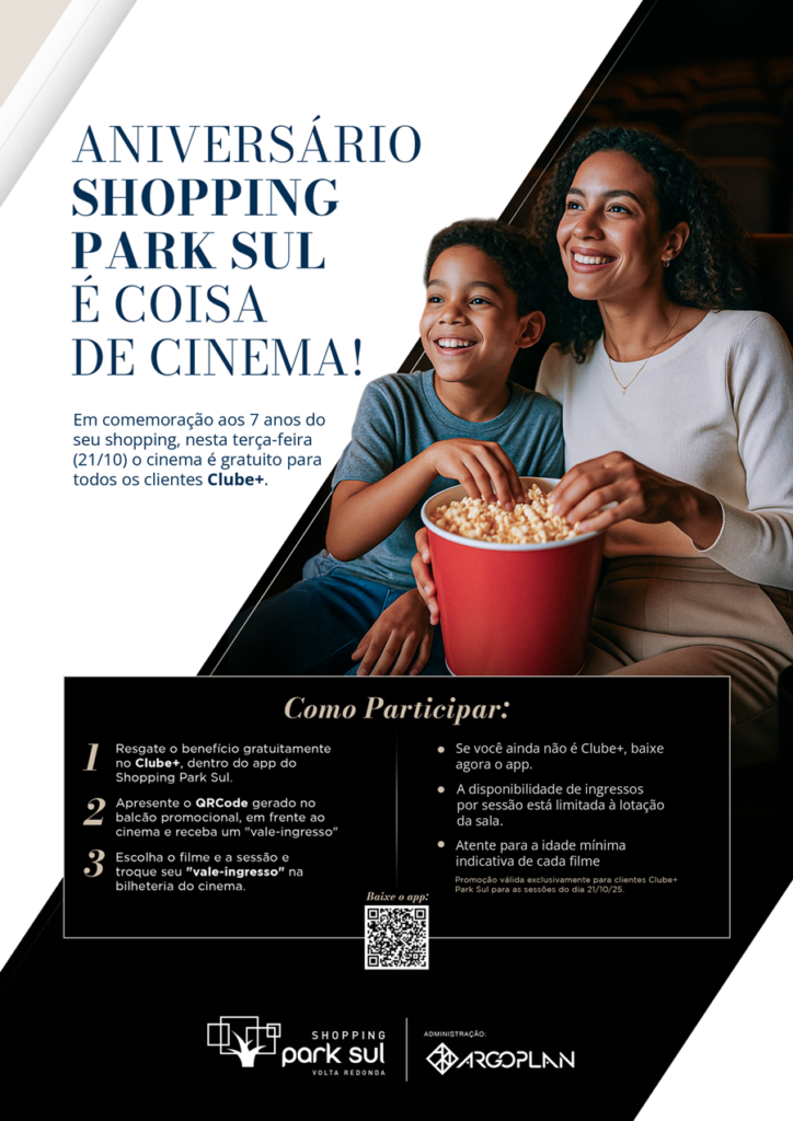 Nesta terça-feira (21), em comemoração ao seu aniversário, o Park Sul fará uma ação inédita: todas as sessões de cinema serão gratuitas para clientes cadastrados no Clube+, o programa de benefícios do shopping.